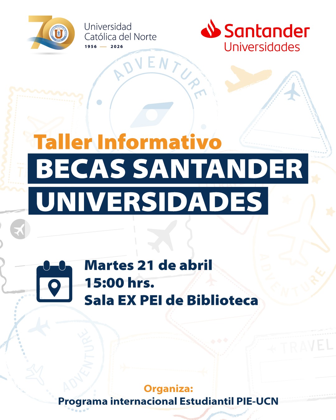 Se invita a participar del Taller informativo de las Becas de Universidades Santander, que se realizará el martes 21 de abril a las 15:00 hrs, sala EX PEI de Biblioteca.