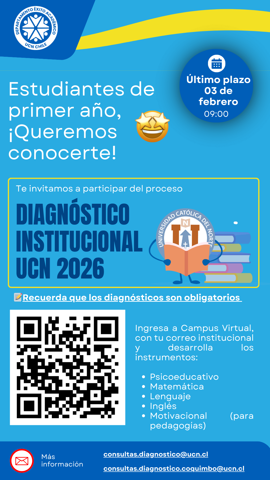 El Diagnóstico Institucional UCN 2026 es un proceso obligatorio para estudiantes de primer año, diseñado para fortalecer la trayectoria universitaria mediante apoyos académicos. Se rinde online desde el 20 de enero al 3 de febrero de 2026 a través del Campus Virtual de la UCN (https://campusvirtual.ucn.cl/) utilizando el correo institucional.
